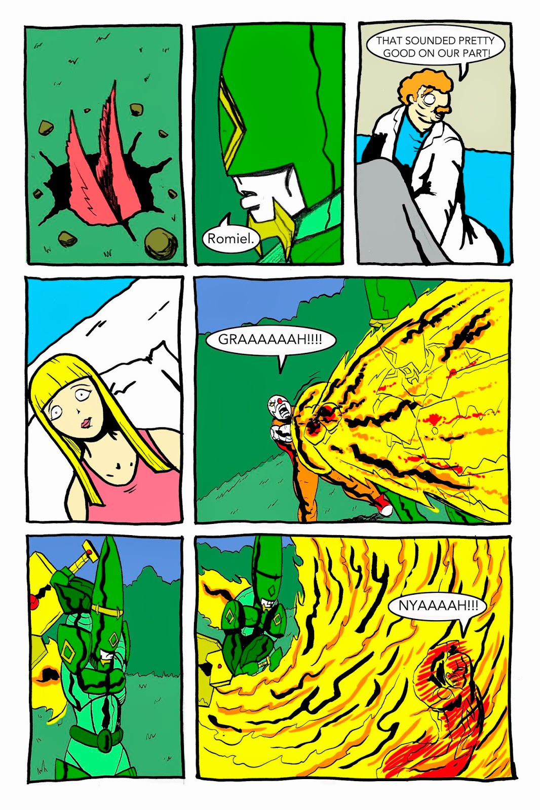 Not much to say about today's page. I added the first panel because we didn't actually show what happened to Romiel, and I also thought it would be funny to just show a hole in the ground with her wings sticking up out of it, as if she'd been hammered into the ground.