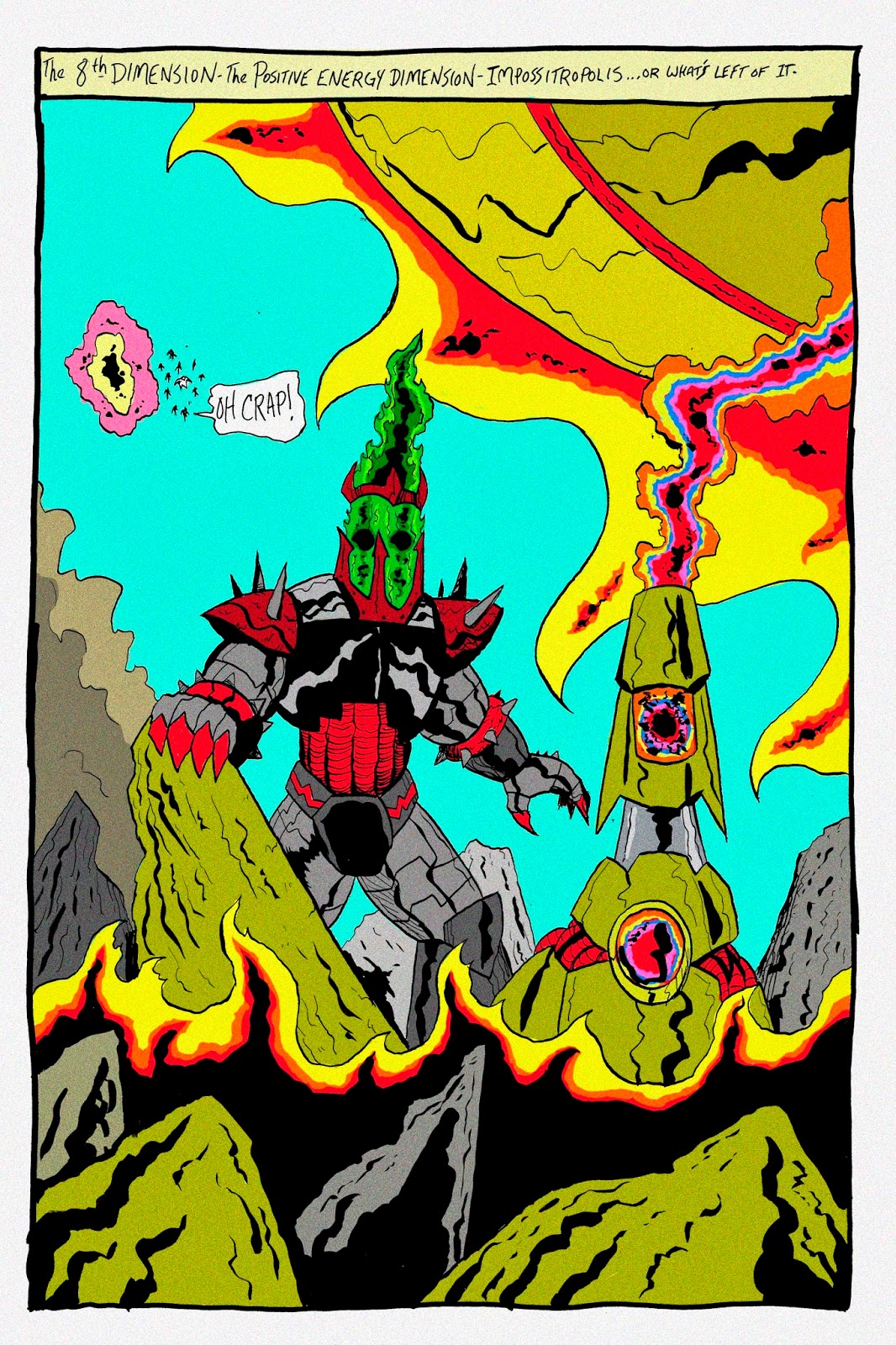 First off, the Ruins of Impossitropolis. Once again, as proof of how terrible I am as a writer, the first time I actually show Impossitropolis I've already wrecked it completely. Shows how stupid I am. Anyway, for some reason when I pictured the 8th Dimension in my Brain, I saw it as having a Gleaming Golden Metal Sun that Burns with Positive Life Energy. Dunno why. That tall thing is the Great Cosmic Wellspring which links the 8th Dimension to the 9th Dimension. It's the only thing that's survived the Holocaust. Speaking of Holocaust, that giant robot monster thing is an Armageddon Titan. We saw one of those guys back in "Clown & Penguin" #1-2. They're world killers, so they are bad frickin' news. I actually drew him bigger than I meant to. Which works out good. That thing should be redonkulously big.